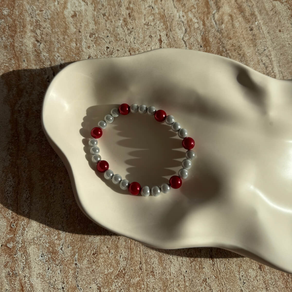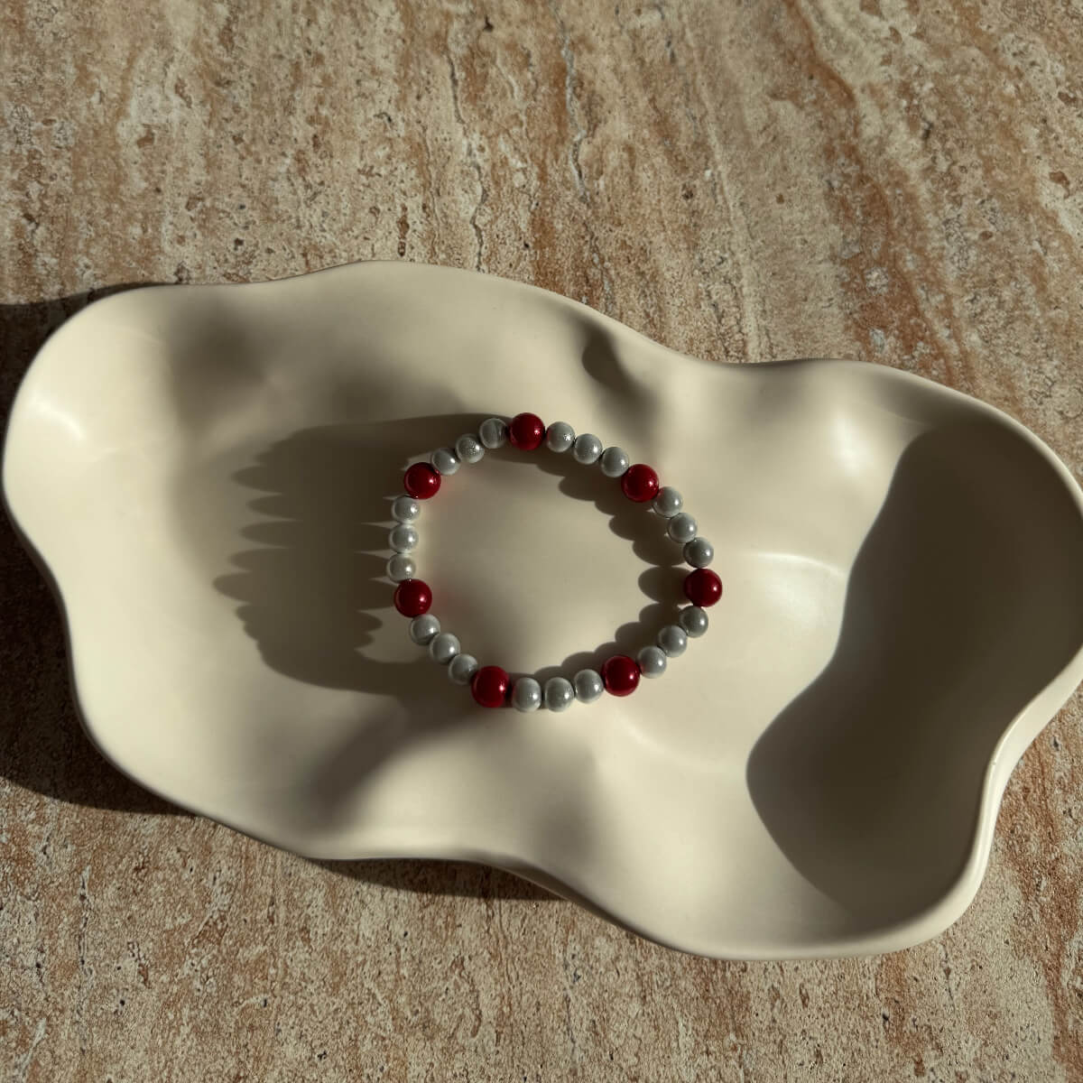 Zarte hellgraue Perlen symbolisieren Gelassenheit, während feine rote Akzente wie kleine Flammen hervorblitzen und dem Design Tiefe verleihen.