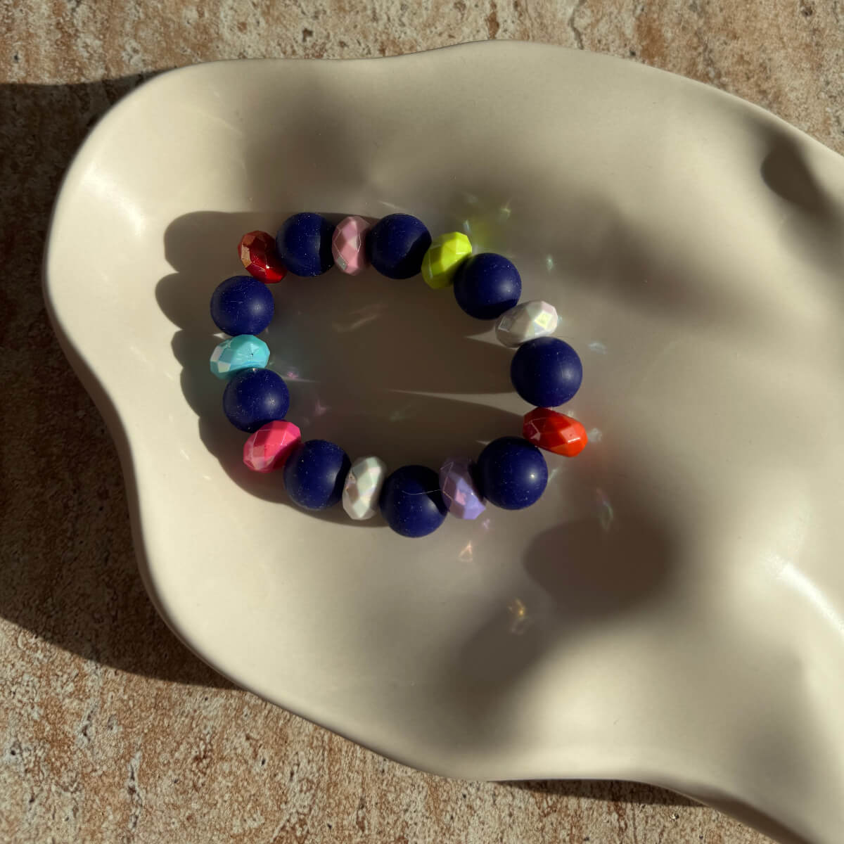 Die tiefblauen, matten Perlen treffen auf leuchtende, facettierte Farben, die wie kleine Lichtpunkte wirken. Jedes Armband wird liebevoll von Hand gefertigt und bringt sofort gute Laune in jedes Outfit – ob als Daily Piece oder für besondere Momente.
