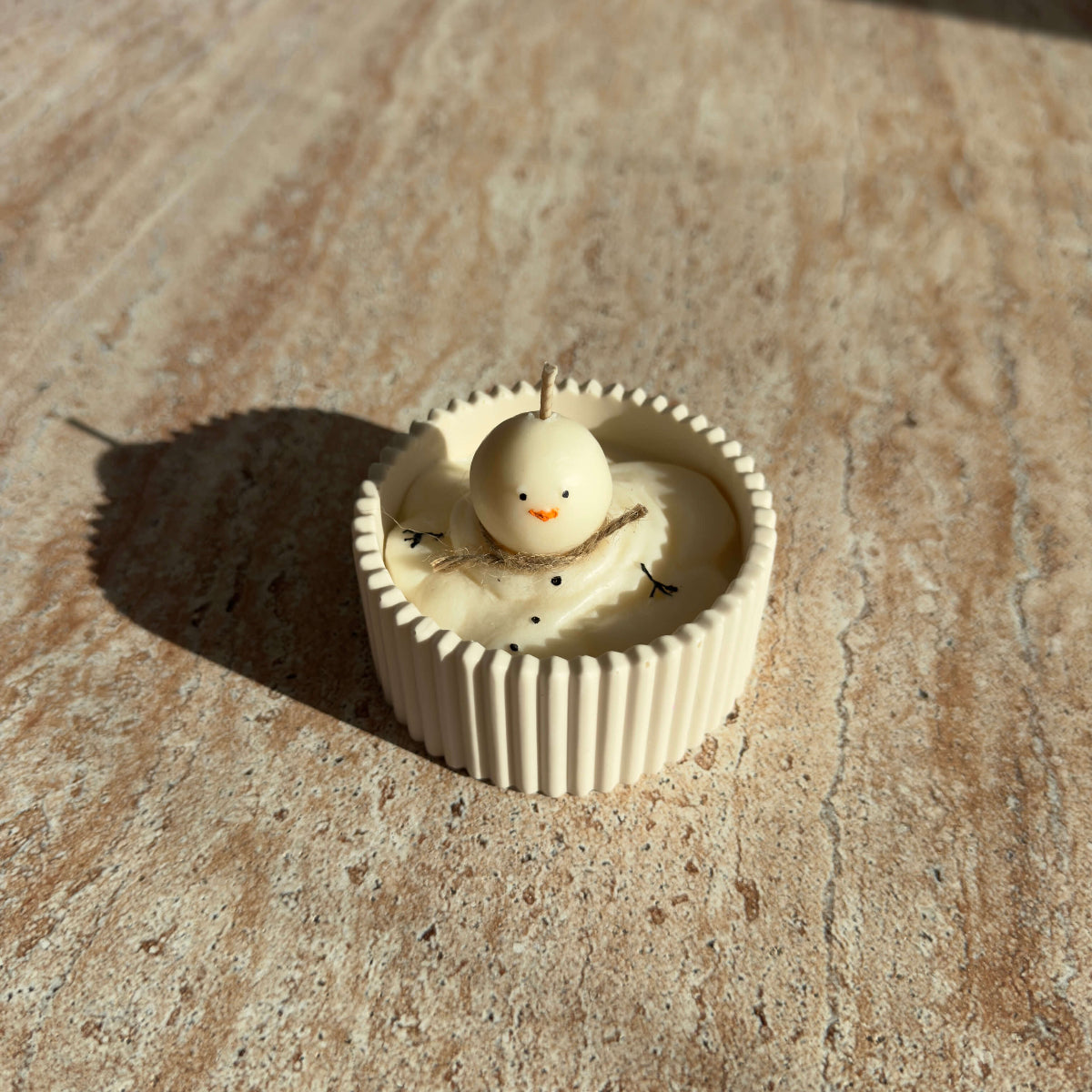 Erlebe den magischen Zauber eines Wintertages mit Frosty’s Melt Moment – unserer handgefertigten Schneemann-Kerze aus 100 % reinem Sojawachs.