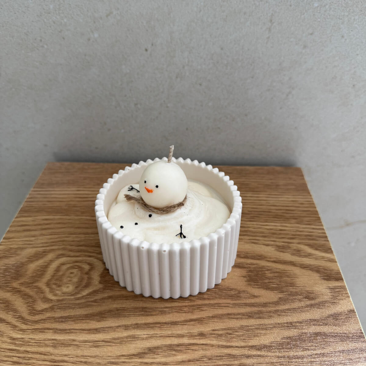 Jede Kerze wird liebevoll von Hand gegossen, mit zarten Details wie Ärmchen, Knöpfen und dem typischen Schneemann-Gesicht verziert und in einer hochwertigen geriffelten Keramikschale präsentiert.